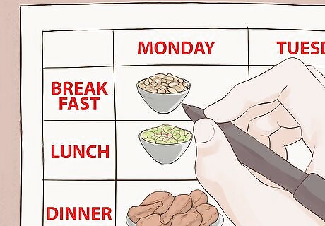 Design a healthy eating meal plan together. One of the first things you and your partner need to do is design a meal plan together. This is when you'll decide what you're eating, how often and choose recipes. Studies have shown that more structured meal plans are more effective at helping people lose weight. Sit down together and write out a week's worth of meals. Make sure that both of you agree on what you're choosing — especially for the meals you're planning on eating together (like dinner). Write out every breakfast, lunch, dinner and snack meal that you will include over the next week. This can help give you structure and a blueprint of how to eat. Plus it can help you come up with your grocery list.