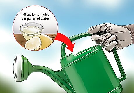 Drop lemon juice in your watering can for a natural fix. If you put ⁄8 tsp (0.62 mL) of lemon juice in 1 US gal (3,800 mL) of water, you can lower the pH by about 1.5 points. The lemon juice can be either freshly-squeezed or bottled, but be sure it's 100% pure. You can also use citric acid instead, but you may need to dissolve it in a little water first. If you're planning to test the water again, stir in the lemon juice and wait about 5 minutes to ensure it disperses evenly throughout the water.
