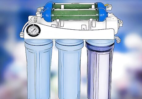 Try a reverse osmosis filter for a large fish tank. A reverse osmosis filter is an extremely efficient filter that removes up to 99% of contaminants from water while leaving the ions that make fish healthy. Since the contaminants are what raise the water pH, the filter will naturally lower the pH level as it cleans the water. These filters can cost upward of $50, and they take up a lot of space, so they’re best for larger tanks.