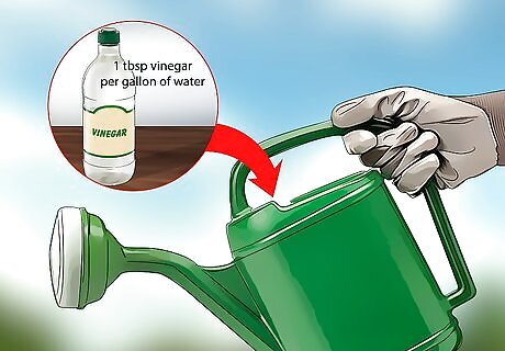 Add white vinegar to the water for an inexpensive fix. Measure 1 US tbsp (15 mL) of plain white vinegar and pour it into 1 US gal (3,800 mL) of water. The natural acidity of the vinegar will help neutralize the alkalinity in the water, bringing a pH of 7.5-7.7 down to about 5.8-6.0. Vinegar has a pH of 2-3 and lemon juice has a pH of 2, so their effect on water is similar.