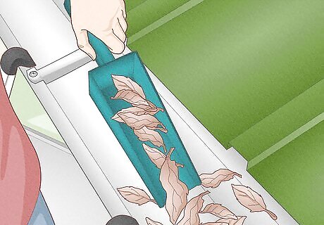 This helps you avoid leaks and water damage on your roof. Starting at the downspout, position your ladder against your roof and clean from the ladder. This is much safer than standing on your roof. Next, use a gutter scoop to remove the leaves and other debris. If anything is lodged or stuck in your gutter, use a water hose to apply pressure and force out the debris. Once everything is cleared, run the hose over the gutters to flush out any lingering debris! You can also make a gutter scoop out of an old container, like a plastic jug. Wear gloves to keep your hands protected and clean. You may need to clean your gutters more often if your house is surrounded by trees.