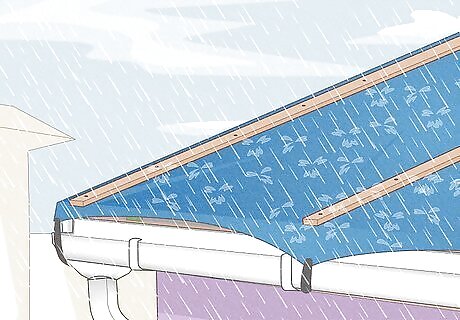This is a dependable, temporary fix in case of emergencies. After extreme weather events like hurricanes or tornados, check your roof for any damage. If fallen trees or debris damage a portion of your roof during the storm, cover the area with a tarp. This helps you avoid further damage to the rest of your roof and the inside of your home. After bad weather, check for accumulation of water and clogs in the gutters. Though it's always best to be on the safe side, metal roofs are able to withstand extreme weather better than other materials. They can handle 140 miles (230 km) per hour winds and heavy rainfall without damage.