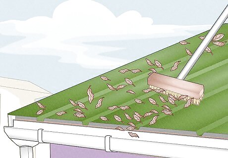 Use a 5% mix of sodium hypochlorite to clean your roof. Debris like leaves and water can damage your roof and eventually lead to corrosion. To clean, apply the solution to your roof and let it sit for 20 minutes. After, wash the roof's surface with a water hose. Usually, one treatment will be enough to remove the debris. If not, try another round of treatment. Inspect your roof at least once a season to see if it needs cleaning. When climbing up and down your ladder, keep 3 points of contact (at least one hand and both your feet) on the ladder at all times. Be very careful when you stand on the roof! As you walk, stay near the metal bolts. These provide sturdier ground. If you're at all nervous about keeping your balance, consider hiring a professional to clean your roof instead.
