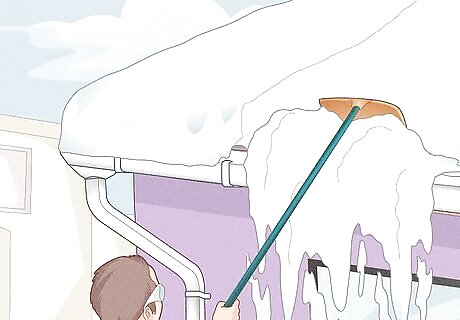 Use a long-handled broom or brush for this method. You can also use a tool called a roof rake. Sweep as much snow or ice off the roof as you can so that your roof doesn't have to carry such a heavy load. It's important to do this before the snow or ice melts, as water can pool on your roof and cause rust or corrosion of the material. Use extreme caution if cleaning snow or ice from a roof with a metal tool, as it may scrape and damage the protective coating of the roof.