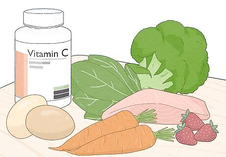 Eat a healthy diet. Foods like carrots, fish, and leafy greens have been shown to improve vision and lower the risk for developing cataracts. Try adding spinach, strawberries, kale, eggs, salmon, olive oil, and nuts to your diet to improve eye health. These foods are rich in antioxidants, lutein, vitamin C, zinc, and vitamin E, and may help reduce the risk of developing macular degeneration and other serious eye problems. Drink green tea. It contains catechins, a type of antioxidant that they eye tissues can absorb well.