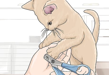 Trim the nails of any pets walking over the floors. Cat and dog claws can scratch the surface of hardwood floors and damage them over time. If you have pets that walk over your hardwood floors, keep their nails trimmed. Dogs can sometimes collect dirt and gravel between their paws that can scratch your hardwood floors as well, so be sure to check them before you let them back into the house. Generally, most dogs need to have their nails trimmed every 1-2 months, depending how fast they grow. Trim your cat's nails every 2 weeks.