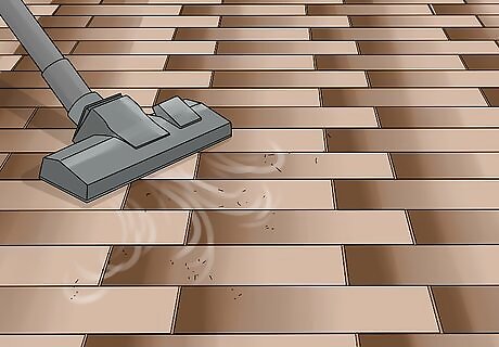 Vacuum weekly with a floor nozzle to pick up dust and dirt. Use a floor-brush attachment to suck up dirt and debris from the surface of the hardwood floor without damaging it. Reach into the corners or crevices to pick up any dust or dirt that your sweeping missed. Avoid using a vacuum with brush rolls or one designed for carpets as they can scratch and damage your hardwood floors.Tip: Use a robot vacuum with soft bristles to continuously vacuum your hardwood floors and keep them clean!