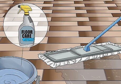 Mop the floors monthly with a wood floor mop and cleaner. For a deeper cleaning, use a wood floor mop with microfiber pads or strings and wood floor cleaner, which won’t strip or strain your hardwood. Dilute the wood floor cleaner in water in a bucket according to the instructions on the label. Dip the wood floor mop into the solution, wring out the excess water, and run the mop over the hardwood following the direction of the grain in the wood. Allow the floor to air dry fully before you walk over it. Work in sections so you don’t miss any spots and start at a far corner so you don’t box yourself into a room or hallway. Be sure to thoroughly wring out the mop so you don’t leave excess water on the surface of your hardwood floors, which could discolor or damage them. You can find wood floor mops and wood floor cleaner at home improvement stores, department stores, and online.