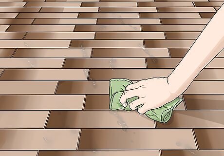 Wipe up spills and messes immediately with a damp cloth. Keep sticky residue from forming by wiping up any messes from your floor as soon as possible. Soak a clean cloth in warm water and wring it out well to remove the excess. Rub the mess up using gentle, circular motions to avoid damaging the wood. For stubborn messes, spray a little bit of wood-floor cleaner onto it and use a damp cloth to wipe it off. You can find wood-floor cleaner at home improvement stores, department stores, and online. Don’t allow moisture to sit on top of your wood floor or it could damage it.