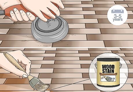 Refinish your hardwood floors every 3-5 years. Refinishing your hardwood floors with a new coat will restore their shine that fades after natural wear and tear. It will also add a protective layer to keep them from getting scratched or faded. Depending on how much use your floors receive, you’ll need to refinish them every 3 years or so. Rooms with hardwood floors that receive little traffic, such as guest bedrooms or dining rooms, may need to be refinished every 5 or 6 years, depending on how dull they appear. Before refinishing your floors, remove the baseboards and sand the surface with 40-, 80-, and 100- or 120-grit sandpaper. Then, vacuum up the leftover dust. Use a rag to apply the finish in swiping motions, following along with the grain of the wood. Always wear gloves when you do this! Once the finish dries for a few hours, you can walk on the floor again.