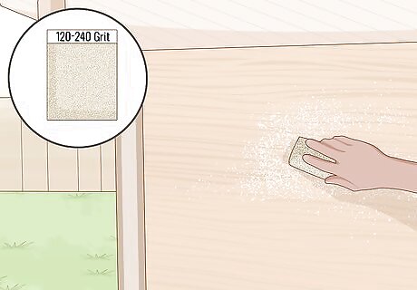 Sand down the scraped area with a fine-grit sanding block. You have two goals here. One is the smooth out any splinters or rough spots on the bare wood. The other is to smooth out the transition between the areas of bare wood and the areas that are still painted. Apply moderate pressure and sand in small circles while largely following the grain of the wood. For larger areas, you can instead use an orbital sander with a fine-grit sanding pad attached. “Fine-grit” is roughly equivalent to 120-240 grit. The wood doesn’t need to be absolutely smooth. A slightly rough texture will actually help the primer and paint stick better. When you’re done, wipe the area with a tack cloth to remove any sanding dust.