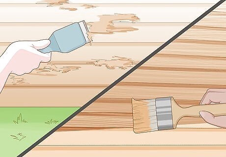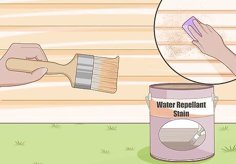 Reapply water repellent stain to stained siding every year. Wash the siding with soapy water and a soft bristle brush, and remove any mildew or rust with specialized cleaners. After rinsing the siding and letting it dry completely, lightly sand the entire surface with a fine-grit (120-240 grit) sanding block or orbital sander, then wipe away the dust with tack cloths. Apply 1-2 coats of water repellent wood stain (clear or tinted) according to the product instructions. Use long, steady strokes with a brush or roller to apply an even coat of stain. Unlike painting, you shouldn’t try to touch-up the stain in certain spots. It needs a new, full coating every year. Reapplying stain to the entire exterior of a home is as challenging as painting it, so you may want to consider hiring a pro to do the job.
