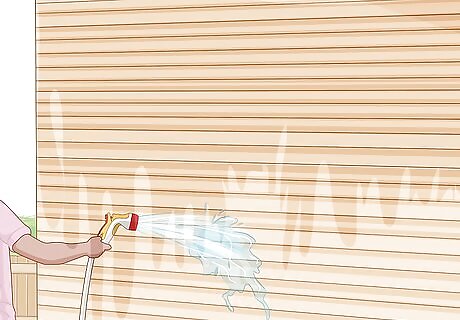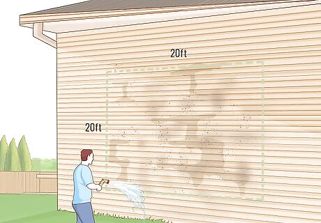 Spray a 20 ft × 20 ft (6.1 m × 6.1 m) section of siding with a garden hose. Visually break up your siding into a rough grid pattern that you can clean section-by-section. Start at the bottom and work your way up, both within each section and overall. Begin by wetting down the siding with a gentle spray of clean water. Cleaning wood siding with a standard garden hose is the easiest and safest method. While it’s possible to use a pressure washer, you risk damaging the siding or forcing water through any cracks or gaps. Cleaning exterior siding from the bottom up reduces streaking.