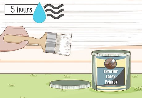 Brush on an exterior latex primer and let it dry completely. Cover every bare surface of wood with an even coat of primer. Use long, even brush strokes and work with the grain of the wood. When you’re finished, wait at least 5 hours before painting so the primer has time to dry completely. If there are nail heads or stains on the wood that need extra coverage, coat them individually with primer to start. After waiting for the primer to dry completely, follow up by coating the entire area with primer.