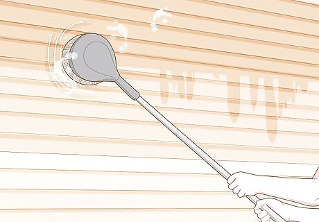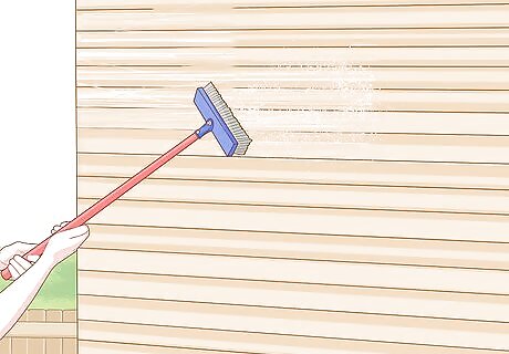 Scrub the siding with a bristle brush dipped in soapy water. Fill a bucket with warm water and just enough dish soap or all-purpose cleaner to create some suds. Dip a cleaning brush with soft, nylon bristles into the water, then scrub the siding with moderate force. Work from bottom to top within the 20 ft × 20 ft (6.1 m × 6.1 m) section you wetted down. Brush with the grain of the wood. For horizontal siding, this means you should scrub from side to side along each piece of siding. If you have vertical siding, work your way from bottom to top along each piece of siding.