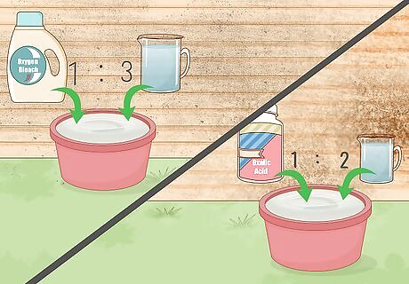 Wash away any mildew or rust spots after the initial cleaning. For dark mildew spots on your siding, apply a commercial mildew cleaner according to the product instructions (you might spray it on directly, or mix it in a bucket of water). Scrub the cleaner into the affected areas with your soft-bristled nylon cleaning brush, then wait 30 minutes before rinsing the cleaner away. Repeat as needed. Instead of a commercial mildew cleaner, you can use 1 part oxygen bleach (not chlorine bleach) mixed with 3 parts water. For rust spots, mix 2 parts water with 1 part oxalic acid. Follow the same cleaning procedure. If possible, also replace the metal item (for instance, a screw or hook in the siding) that is creating the rust. Put on eye protection and wear protective cleaning gloves when using mildew cleaners, oxygen bleach, or oxalic acid. Also cover any plants that may come in contact with the cleaner.