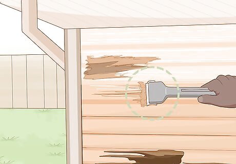 Scrub areas of worn or chipped paint with a stiff wire brush. After cleaning the siding and allowing it to dry completely, identify all the areas where the paint job needs a bit of work. Work a stiff wire brush back-and-forth with the grain (that is, horizontally on horizontal siding) to remove chipped areas of paint and break open areas where the paint has bubbled or peeled away from the wood. Completely repainting wood siding is a much more involved process, and is best started by applying a chemical paint stripper to remove as much existing paint as possible. Depending on your DIY skill level, you may find it preferable to hire a professional house painter.