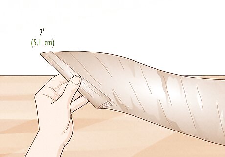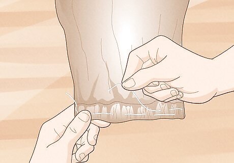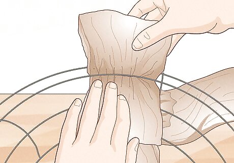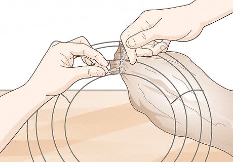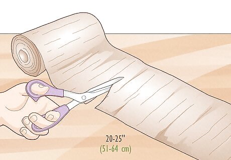 Cut a 20 to 25 inch (51 to 64 cm) piece of burlap for each 12 inch (30 cm) frame. Burlap rolls are typically sold in 100 yard (91 m) bundles, which is enough for plenty of wreaths! Every 20 to 25 foot (6.1 to 7.6 m) piece of burlap you cut should fill 1 wreath, although you will be cutting it into smaller pieces as you work. Purchase burlap rolls at crafts stores, department stores, big-box stores, and online suppliers. Find an old piece of burlap and cut it to size with a pair of scissors to skip purchasing a roll.