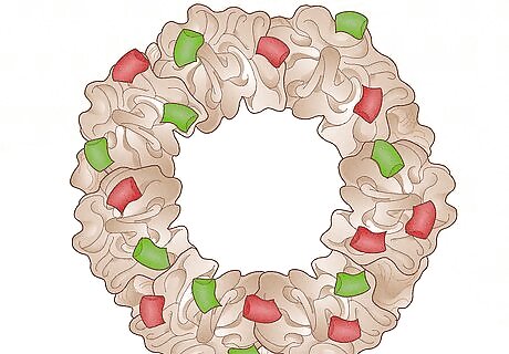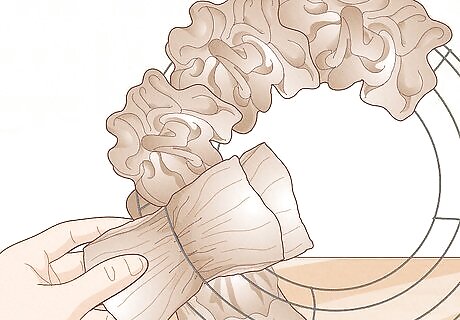 Continue pressing loops of burlap across the wreath's circumference. Always work from the inner section to the outside and be sure that each bundle is comprised of 2 to 3 loops. If you prefer a compact wreath, aim for about 3 bundles for each section. For a looser wreath, 2 bundles will suffice. Use between 12 to 36 feet (3.7 to 11.0 m) of burlap in total and increase your usage for more compact loops.