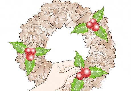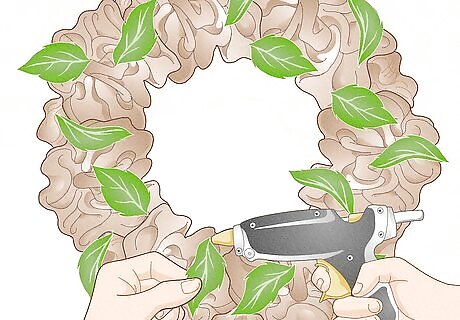 Decorate the wreath with plastic leaves to match your theme. Purchase plastic decorative leaves and attach them to your burlap with some pins or a glue gun. If you're using glue, a small dab should be enough. Add some gold floral leaves around the edges for a fall theme. Attach snowflake decorations during Christmas season.