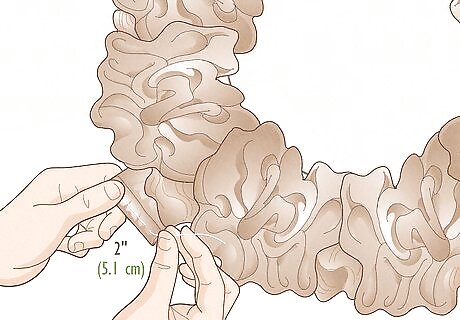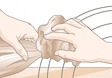 Press the first 4 to 6 inches (10 to 15 cm) of the burlap through the inner section. The inner section is closest to the center hole of the wreath and designated by the 2 innermost wires. Place your non-dominant hand underneath the burlap and press it upward through the inner section. Continue feeding it through by pulling it with your dominant hand until the loop extends about 2 to 3 inches (5.1 to 7.6 cm) upward. Since there are 2 layers, this totals about 4 to 6 inches (10 to 15 cm) of burlap. Use your first 4 fingers as a guide for loop size. If the loops are loose around your fingers, pull down on the burlap until it fits snugly over them. Increase loop size for a fluffier wreath and decrease it for a tighter wreath.