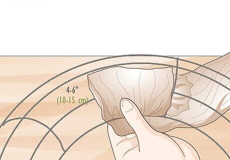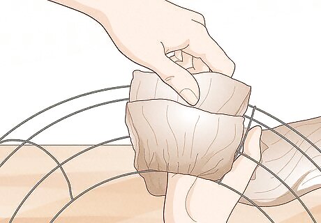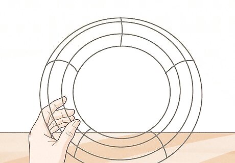 Fasten the folded end of the burlap to a divider bar. The divider bars run horizontally across all 4 rings of the wreath. Within these rings are the inner sections, middle sections, and outer sections, each designated by the wire rings. Place the burlap underneath the divider bar at the top of the wreath farthest from you. Pull each wire through the bottom section closest to you on either side of the bar and tie them into a knot around it. Snip off the excess wire afterward using wire cutters.