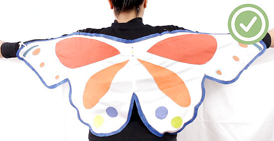 Cut out shapes of foam or different colored fabrics and glue them on if you want a 3D effect. If the template you used includes various shapes, then you can use these to cut out fabric pieces that you can glue onto your wings. If the wing template does not include shapes, you can draw your own using an image of butterfly wings as your guide. Cut out teardrops and dots and attach them to the wing with fabric glue. Position the teardrops in the middle of the wings with the pointed ends facing in and place the dots along the outer edges. To attach the shapes you can use hot glue, fabric glue, or needle and thread. Make sure that whatever you do use to attach the embellishments is durable.Watermark wikiHow to Make a Butterfly Costume Butterflies usually have intricate patterns on their wings, but don’t worry if you can’t replicate it exactly. Gluing a variety of shapes to the wing will create the desired effect.