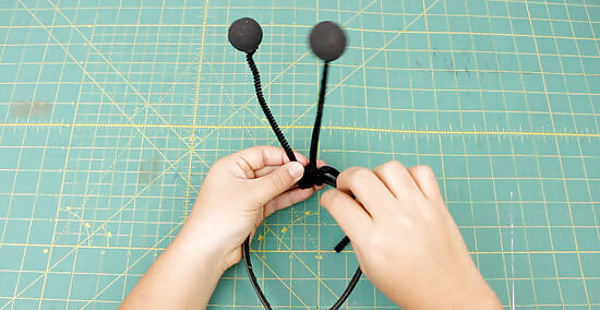 Make a simple antennae headband to wear. Glue 1 pom-pom to the end of a pipe cleaner. Then repeat with another pom-pom and pipe cleaner. Let the glue dry overnight. Wrap the free end of the pipe cleaner around the center of a headband. Repeat this with the second pipe cleaner and pom-pom. Adjust the antennae to your liking, such as by separating the pom-poms or bending the pipe cleaners slightly. Wear the antennae headband with your butterfly wings to complete the costume.