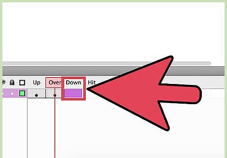 Define the down frame. The down frame defines the appearance of the button when the user selects, or clicks, it. Select the box directly below “Down” on the timeline. Select Insert > Timeline > Keyframe. The button you created in the up frame should appear on the stage. You can change the location and/or appearance of the button with the tool bar or the properties panel.
