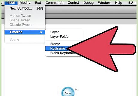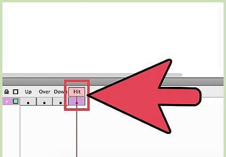 Define the hit frame. The hit frame defines an area on the stage that is responsive to the user's cursor. The hit frame is useful if your button is small or oddly shaped. Select Insert > Timeline > Keyframe. Draw a shape that encompasses all three frames and or a larger area. This shape will not appear in the scene or the final product. Defining the hit frame is optional. If you choose not to define it, the up frame will serve as the default hit frame.