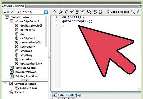 Insert the frame or scene number. For some functions, you will need to list a specific frame or scene to go to. Insert the frame or scene number into the parens next to the named function. on (press) { gotoAndStop(12); }