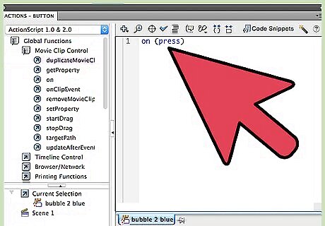 Determine when the action will occur. Events are timing cues that communicate to the program that something has happened. For buttons, these timing cues are executed by the mouse. The event is placed within the parens. Common mouse-related events include press: task is executed when the button is pressed; release: task is performed when mouse is released; rollOver: task is completed when mouse is rolled over the button. on (press)