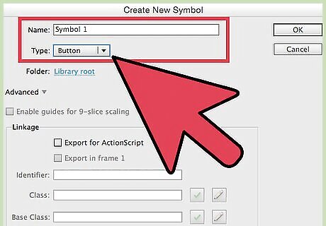 Insert a button. In Adobe Flash, buttons are quickly created with the button symbol function. To access this function, you can select Insert > Symbol, use the Windows shortcut Ctrl+F8, or use the Mac shortcut ⌘ Command+F8. In the dialog box, enter a new name into the “Name” field. Use the dropdown menu next to “Type” to select “Button.” The button will appear in your library (see right panel).