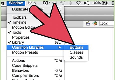 Define the up frame. Your button has four distinct states: up frame, over frame, down frame, and hit frame. These states are visible in the timeline. The up frame defines the appearance of your button when it is not in use. To create the up frame appearance, you may use the drawing tool. Instead of drawing your own button, you can import a graphic from the “Common Libraries.” Select Window > Common Libraries > Buttons. Choose a button graphic and drag it onto the stage.