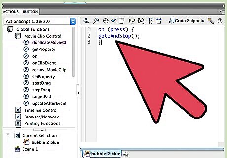 Name the function. After the close parenthesis, insert a pair of brackets { }. The function you wish to occur when the event occurs in placed within the brackets. Common functions include: play, stop, gotoAndPlay, gotoAndStop, nextframe, next scene, prevFrame, prevScene, stopAllSounds. on (press) { gotoAndStop(); }