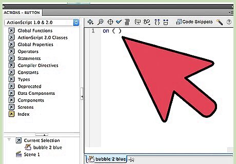 State the function. In Adobe Flash, functions perform specific, repeatable tasks. When the user interacts with buttons via the cursor, these tasks occur. This function is indicated in the actionscript code by on. on ( )