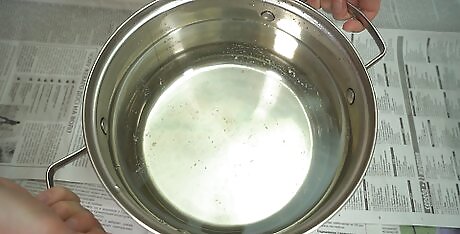 Fill a bucket with warm water based on how much fabric you’re dyeing. If you have a thermometer, try to get the water to between 110–115 °F (43–46 °C). The general rule is to use 3 gallons (11 L) of water for each 1 pound (450 g) of fabric you need to dye. Because you need some space to submerge and stir the fabric, choose a bucket that’s the next size up from how much water you need. For example, if you are dyeing 1 pound (450 g) of fabric, use a 4–5 US gal (15–19 L) bucket. For fabrics less than 1 pound (450 g), a 3 US gal (11 L) bucket should work just fine. As with your rubber gloves, plan on using this bucket solely for dyeing purposes to avoid cross-contamination. Using a dye vat don’t require you to heat anything on the stove, so you could use a plastic container if you want. Avoid using containers made of copper, iron, or galvanized steel as they could change the color of the dye.