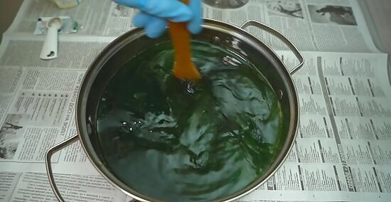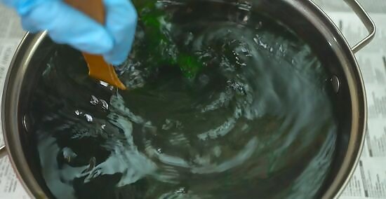 Submerge the fabric in the vat and stir it continuously for 10-30 minutes. The dye will saturate the fabric more evenly the more you stir it, so don’t skip this step! It’s a lot of work, but try to stir the fabric the entire time it’s in the vat. Use your wooden stirrer to agitate the fabric. After 10 minutes, lift the fabric out of the vat and look at the color. If you want it to be deeper, stir it for another 10 minutes, and so on. The longer the fabric is in the dye, the darker the shade will get. Remember to wear your rubber gloves. You can pick up the fabric and examine it to make sure the dye is distributing evenly, but you don’t want to do that with bare hands.