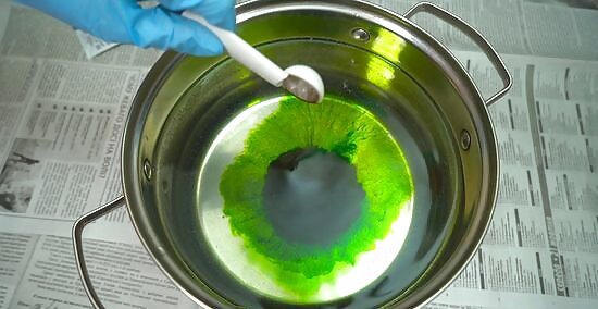 Reverse direction and stir counterclockwise to form a dye “bloom.” Once you no longer see any granules of dye, reducing agent, or soda ash, switch directions with your stirring stick. Move the stick to the edge of the bucket and stir until you see a collection of bubbles forming in the middle of the vat. Once it’s about as wide as your fist, you can stop stirring. This “bloom” is a collection of all the oxygen in the bucket. It releases it from the liquid so that you’re left with a smooth dye that will evenly permeate fabrics.