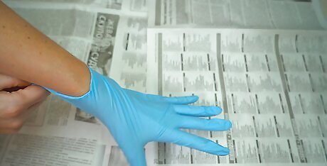Put on a pair of rubber gloves and clothes you don’t mind getting dirty. The last thing you want after dyeing fabric is to come away with hands and wrists stained an unnatural color! Put on an old T-shirt and pants so you don’t have to worry about stains, and invest in a large pair of rubber gloves. Plan on designating the rubber gloves just for dyeing purposes. While you can rinse them off and clean them, there’s still a chance of cross-contamination if you were to use them to handle raw meat or something similar.