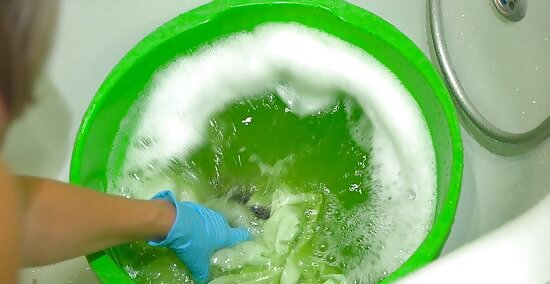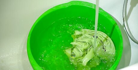 Take the fabric to a tub and rinse it with cool water until it runs clear. This is best done in a washbasin if you have one available in a laundry room or garage. If you don’t, you could always use a large bucket and a hose and do it outdoors. If you have to rinse the fabric in a kitchen sink or bathroom tub, be aware that some dyes can stain porcelain, acrylic, and any kind of porous surface. If something does get stained, many bleach-based cleaners can get the stains out. The manufacturer’s website may also have some helpful tips on how to get their dye off of various surfaces.