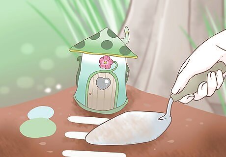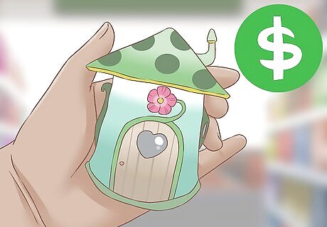 Purchase items. If you don't mind mixing things up, the fairy garden village can benefit from having a mixture of purchased and handmade items. Or, simply stick to the purchased items if preferred. Things you can purchase include miniature fairy houses, ceramic fairies, ceramic pieces such as a well, a swing or a tower and dollhouse items of all sorts. The main thing is to only use items that can withstand being outdoors and getting weathered. Some suggestions for locating items include: Visit charity, thrift and used goods stores. Many miniature items can be found in such places for a bargain price, and you can have lots of fun rummaging about for the best pieces. Check out hobby or toy stores, including ones online. Look for fairy designed items and for dollhouse things. See what crafters have to offer on sites such as Etsy, eBay and their own personal online stores. You might find some lovely items for sale that are just perfect for your fairy garden village.