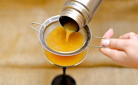 Shake and strain the cocktail. Shake the cocktail vigorously for 10-15 seconds to mix all the ingredients evenly. If it's not as sweet as you like, add ⁄2 teaspoon (2.5 mL) of honey and shake it again. Pour it through a mesh strainer into a glass. This cocktail tastes best when served in a chilled cocktail glass. Garnish it with a fig.