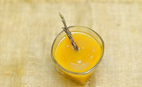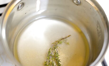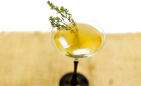 Make the thyme simple syrup. You will need thyme simple syrup for this cocktail, which you should prepare before you mix the other ingredients. For the thyme simple syrup, mix 1/2 cup (100 grams) of sugar and ⁄2 cup (120 mL) of water in a saucepan over medium heat until the sugar dissolves. After the sugar dissolves, add 5 sprigs of thyme. Allow the mixture to simmer for 10 more minutes. Let them mixture cool for a bit before making your cocktail.