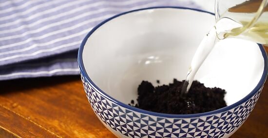 Add in ⁄2 c (120 mL) of olive oil or coconut oil. Pour in olive oil or liquid coconut oil to your mixture, then use your spoon to combine all of your ingredients. The mixture will start to form a thick paste that’s easy to spread with your spoon. Since coffee grounds are already a little sticky, you don’t need as much oil.