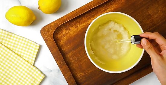 Add in 10 to 20 drops of lemon essential oil. Grab a bottle of lemon essential oil and use the dropper on the lid. Add in 10 to 20 drops of lemon essential oil, then stir the mixture to spread the lemon scent out evenly. Lemon is a refreshing citrus scent that will perk up your skin and soothe it at the same time.