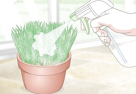 Scatter seeds in the pot and cover them with a thin layer of topsoil. Spread the seeds evenly across the soil until it’s completely covered. It’s okay for the seeds to overlap since the grasses’ root systems don’t take up much room. Once your seeds are in the pot, cover them with about ⁄4 in (0.64 cm) of soil. Cat grass seed packs can be purchased from your local pet store, garden center or online. You may soak the seeds in a bowl with water one day before you plant them to help speed up germination. The seeds will absorb the water and are more likely to sprout within a few days. Choosing a Type of Grass Oat grass has a sweet flavor that your cat will like, but it requires direct sunlight to grow best. Wheatgrass provides your cat with vitamins, minerals, and helpful amino acids. Ryegrass has smaller blades that your cat can lounge on in if it’s planted in a tray. Barley grass has vitamins, minerals, amino acids, and enzymes to help your cat’s digestion.