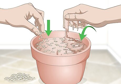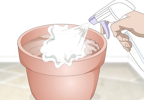 Mist the soil until it’s moist. Put water in a spray bottle and gently mist the topsoil. Keep spraying water onto the soil until it feels damp to the touch. Don’t leave any standing water on the surface or else your seeds may not grow. Don’t pour water directly into the pot since it might drown the seeds and prevent growth.