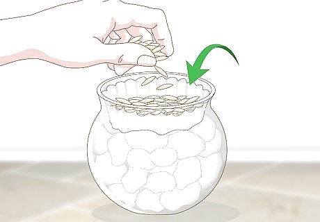 Pour water in the bowl or jar up to the layer of paper towel. Slowly add the water to the container, so your seeds aren’t disturbed. Keep filling the container until the water touches the filter. The filter will absorb the water and keep your seeds moist so they can germinate. If you notice the water level ever drop below halfway, refill the container back up to the filter.
