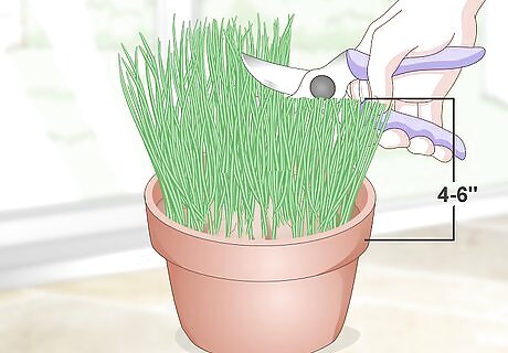 Trim the grass between 4–6 in (10–15 cm) when it gets too long. If your grass gets too long, your cat may be able to pick up the plants and destroy the grass pot. Use a pair of gardening snips to trim the grass until it’s 4–6 in (10–15 cm) tall.